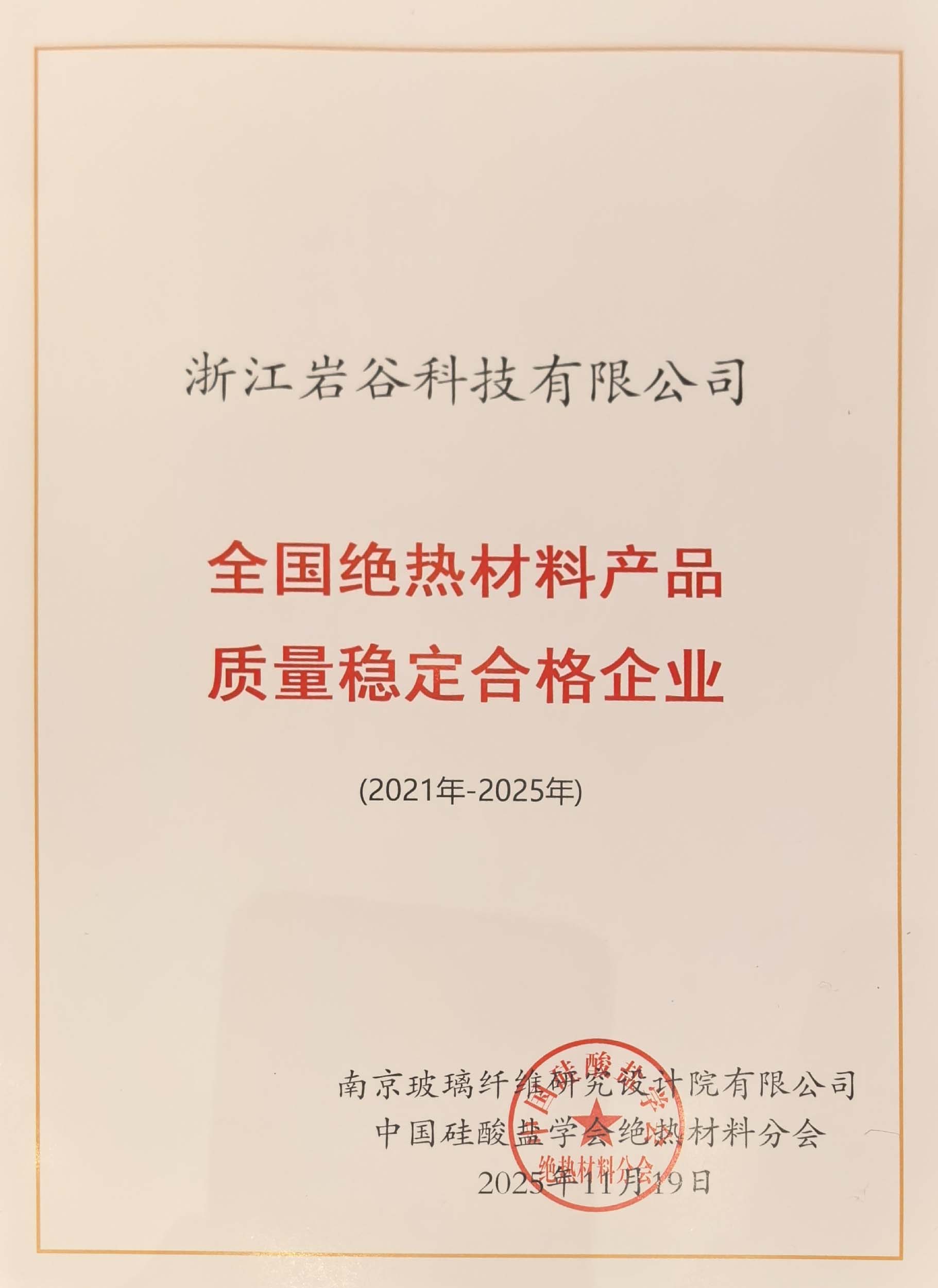 2025年11月19日,巖谷科技在第九屆中國絕熱材料行業學術年會中首次獲得“全國絕熱材料產品質量穩定合格企業”。